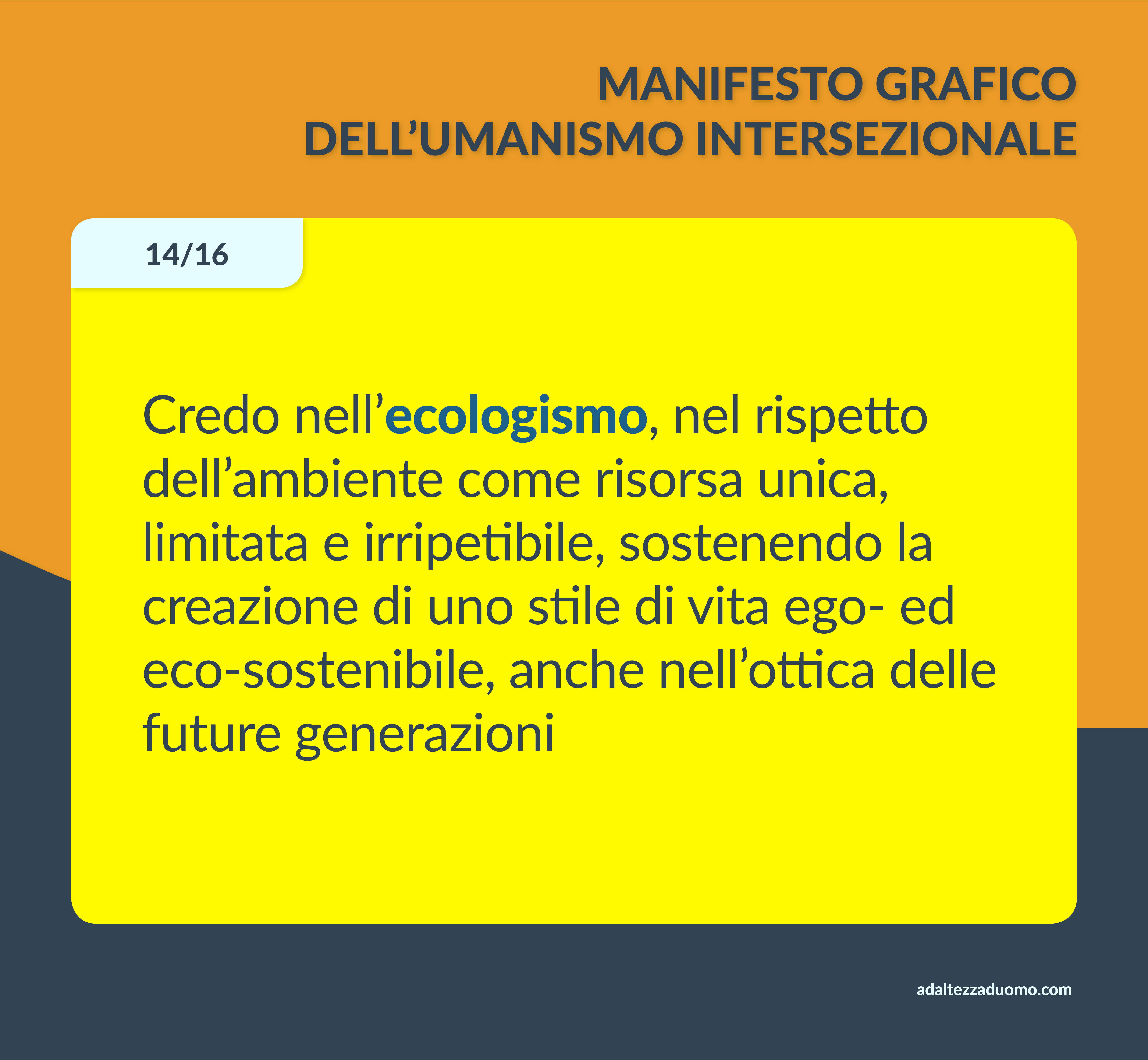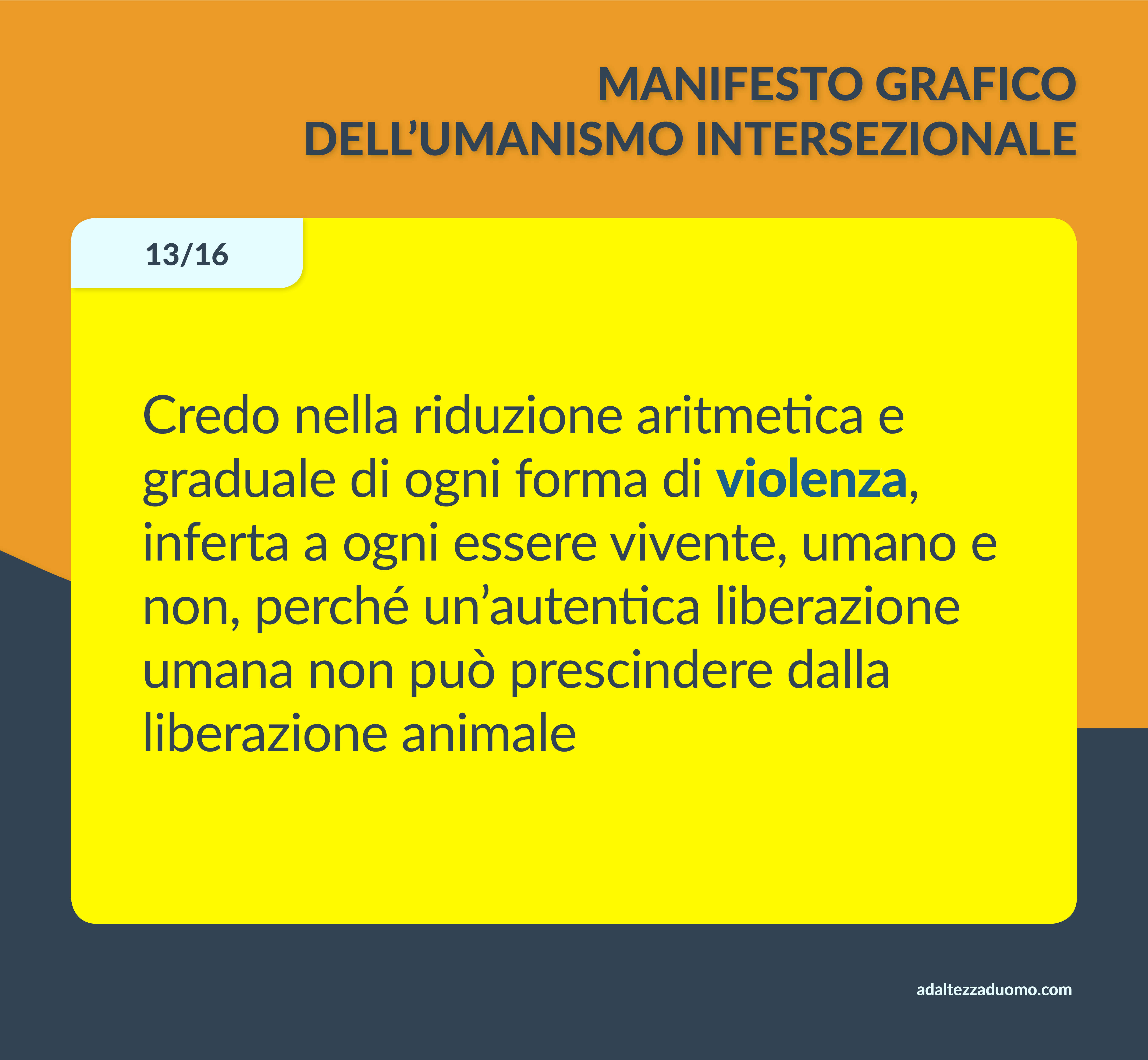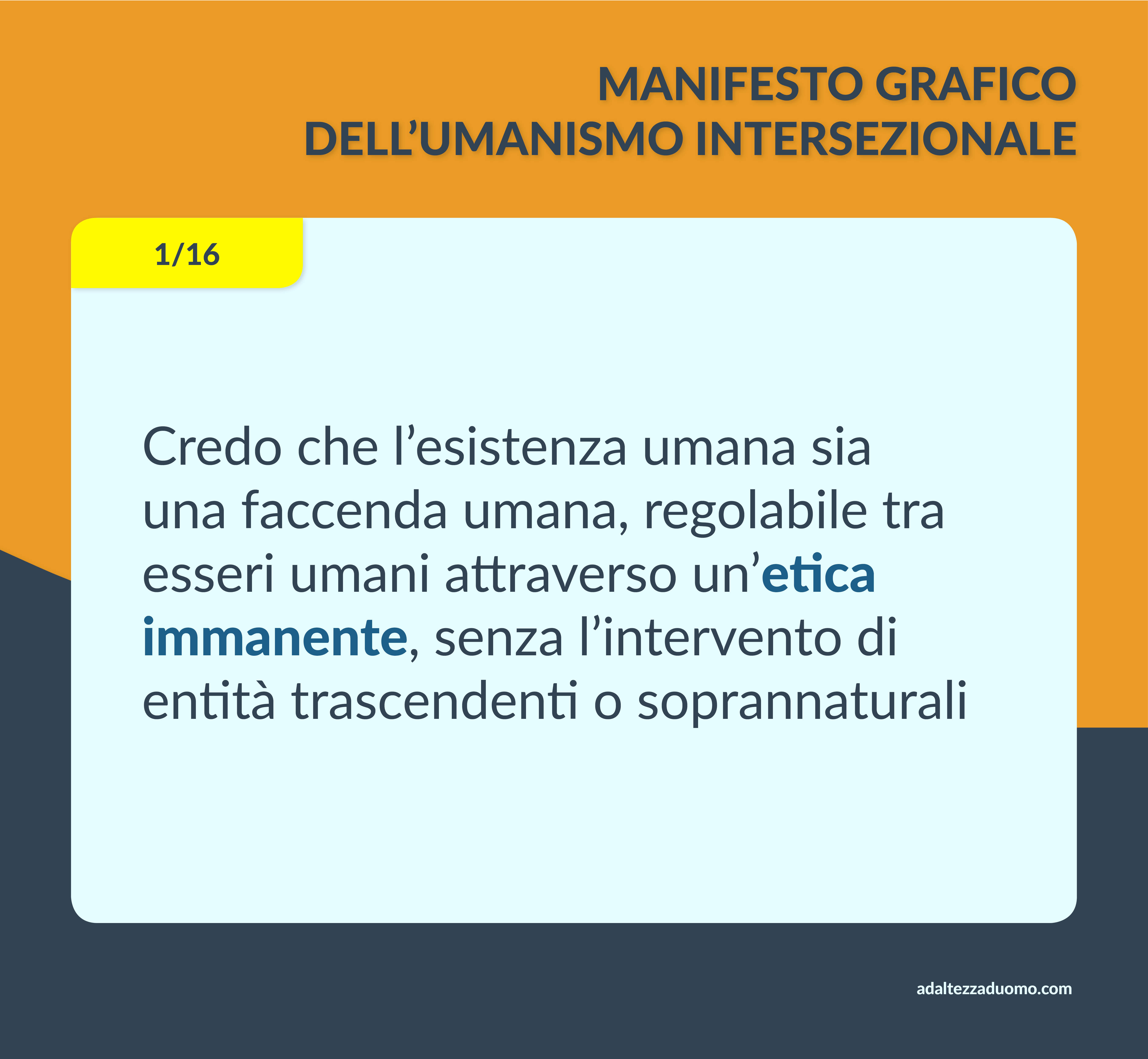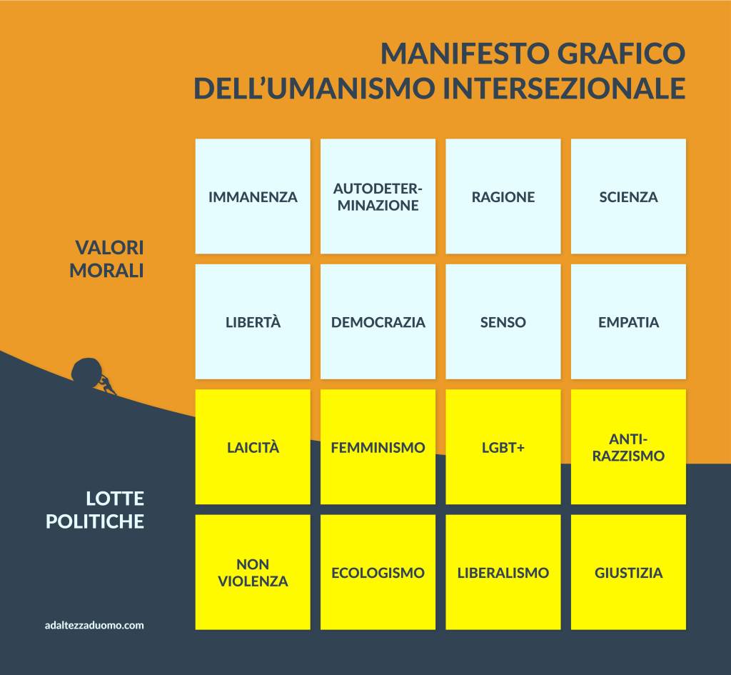 Questo è il Manifesto Grafico dell’Umanismo Intersezionale. Ne riassume in grafica i valori morali e le lotte politiche. Ognuno può sottoscriverlo o condividerlo secondo coscienza, senza bisogno di intermediari o cerimonie di alcun tipo.