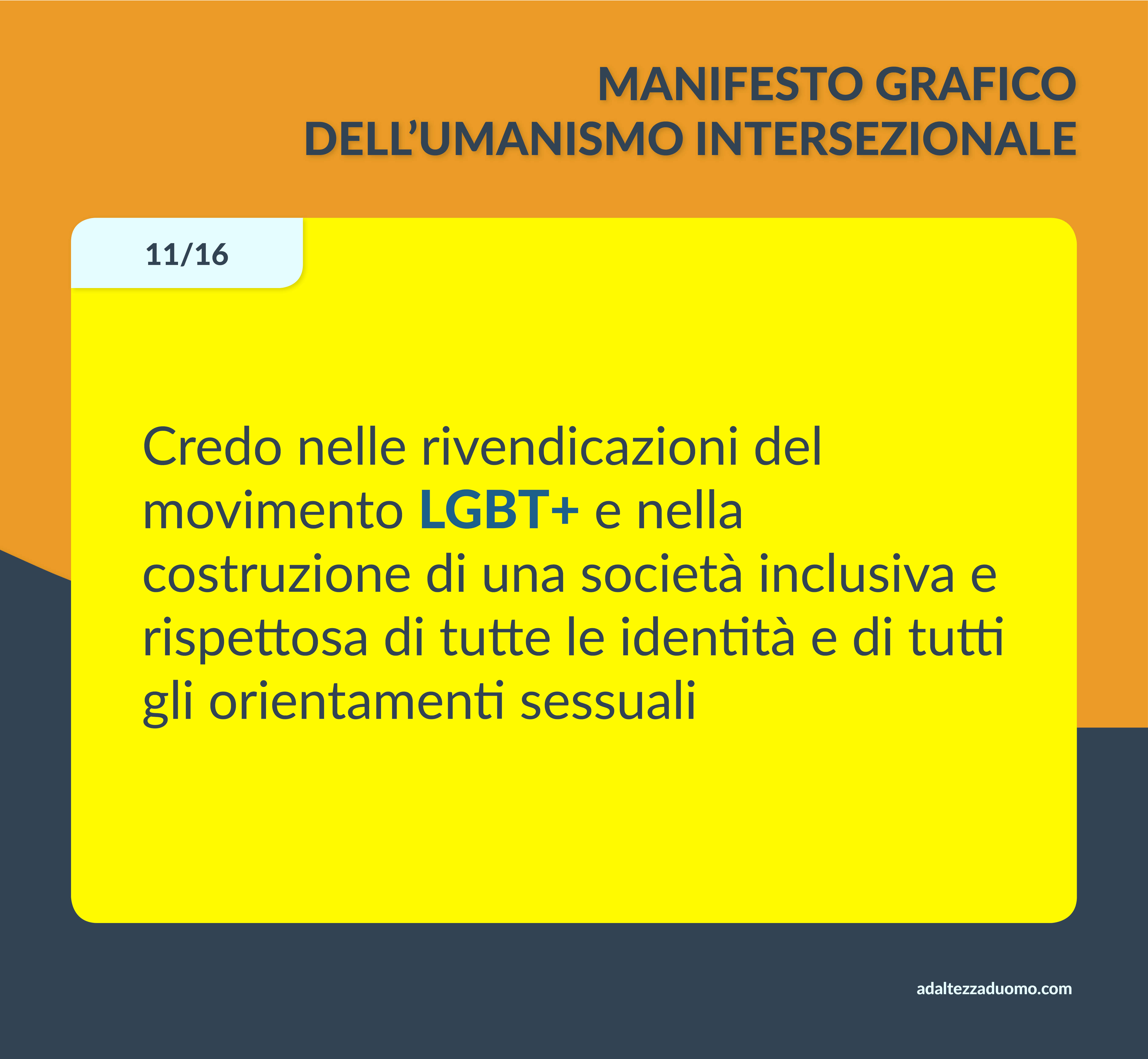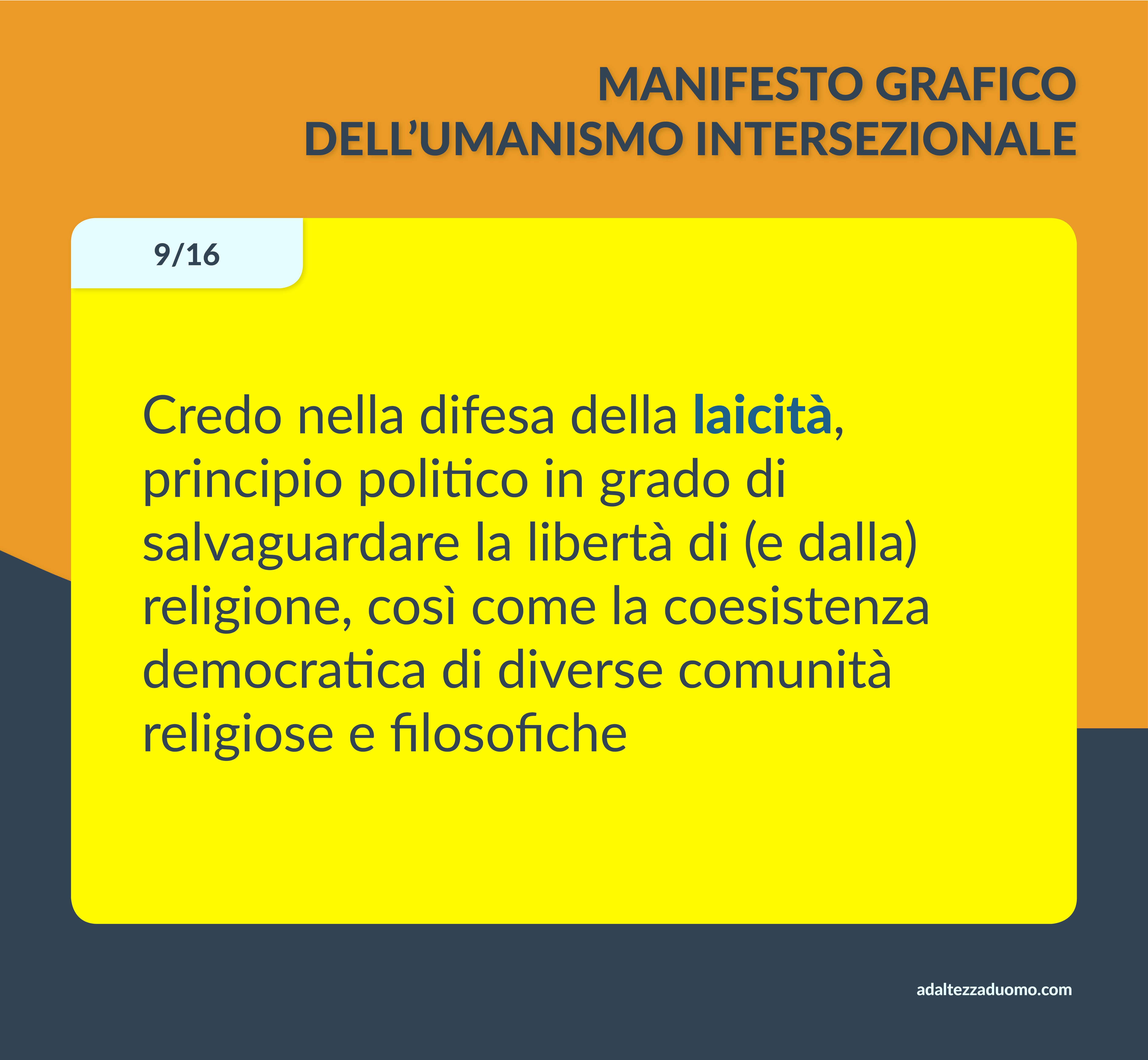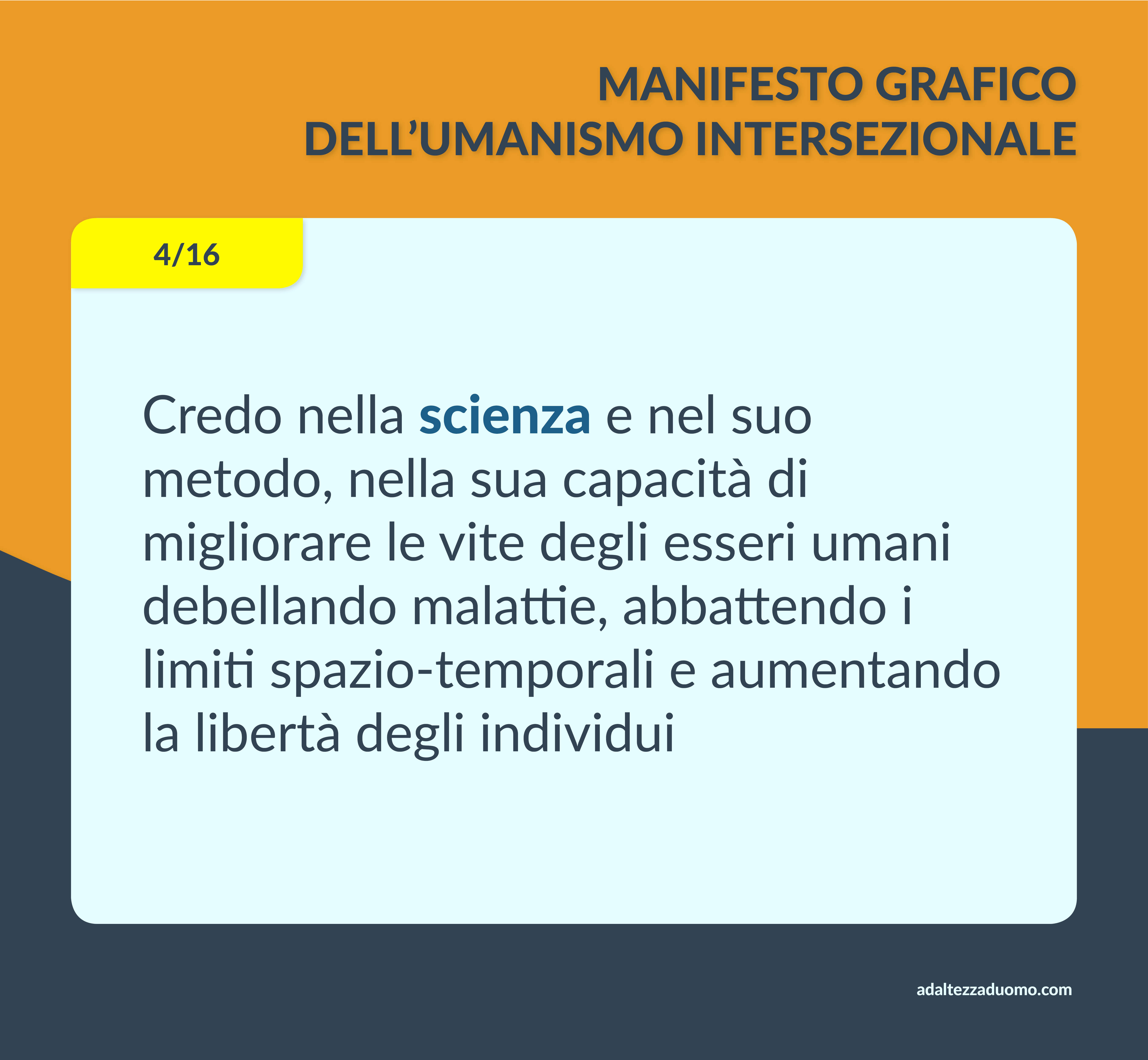 Questo è il Manifesto Grafico dell’Umanismo Intersezionale. Ne riassume in grafica i valori morali e le lotte politiche. Ognuno può sottoscriverlo o condividerlo secondo coscienza, senza bisogno di intermediari o cerimonie di alcun tipo.