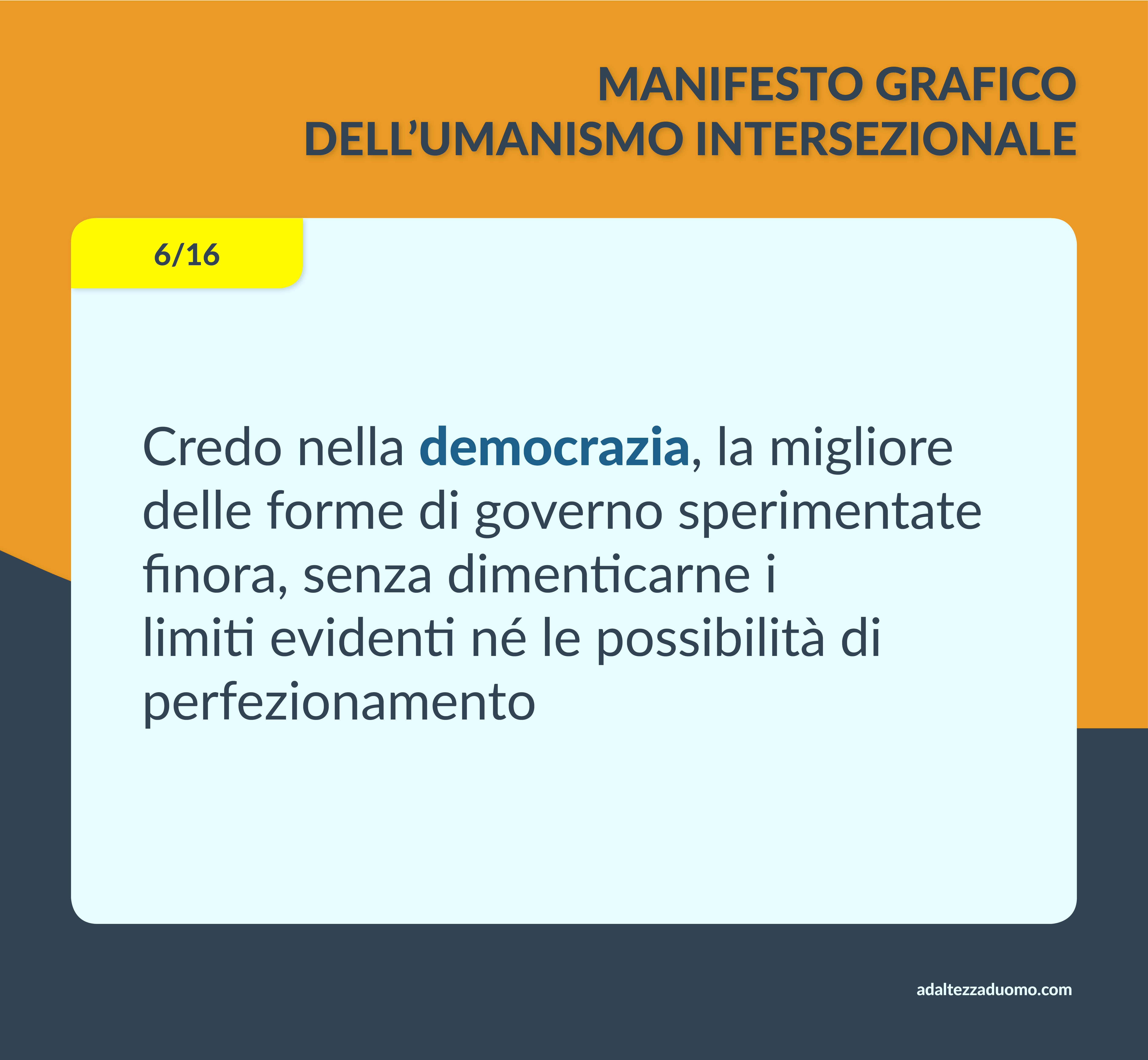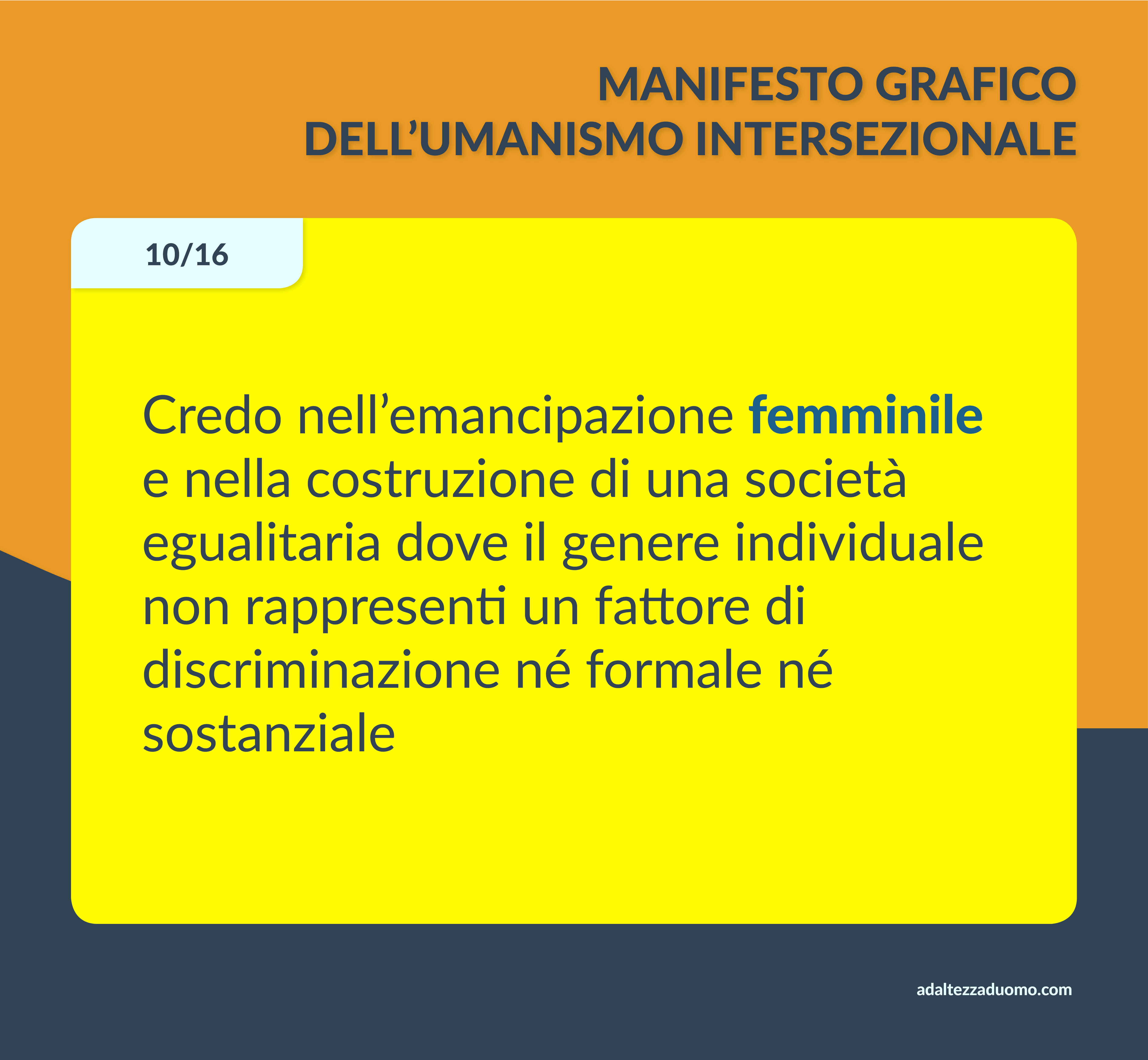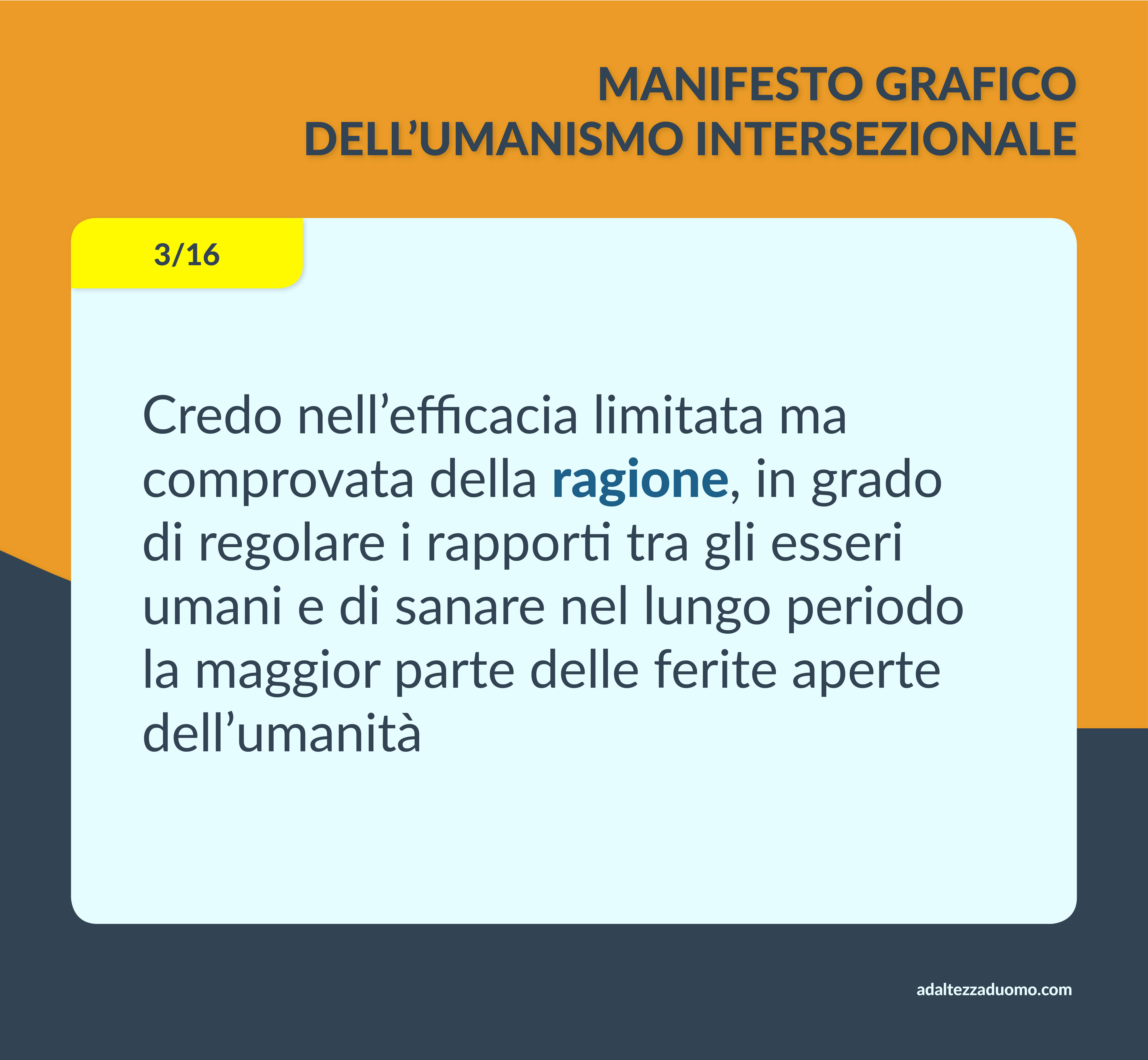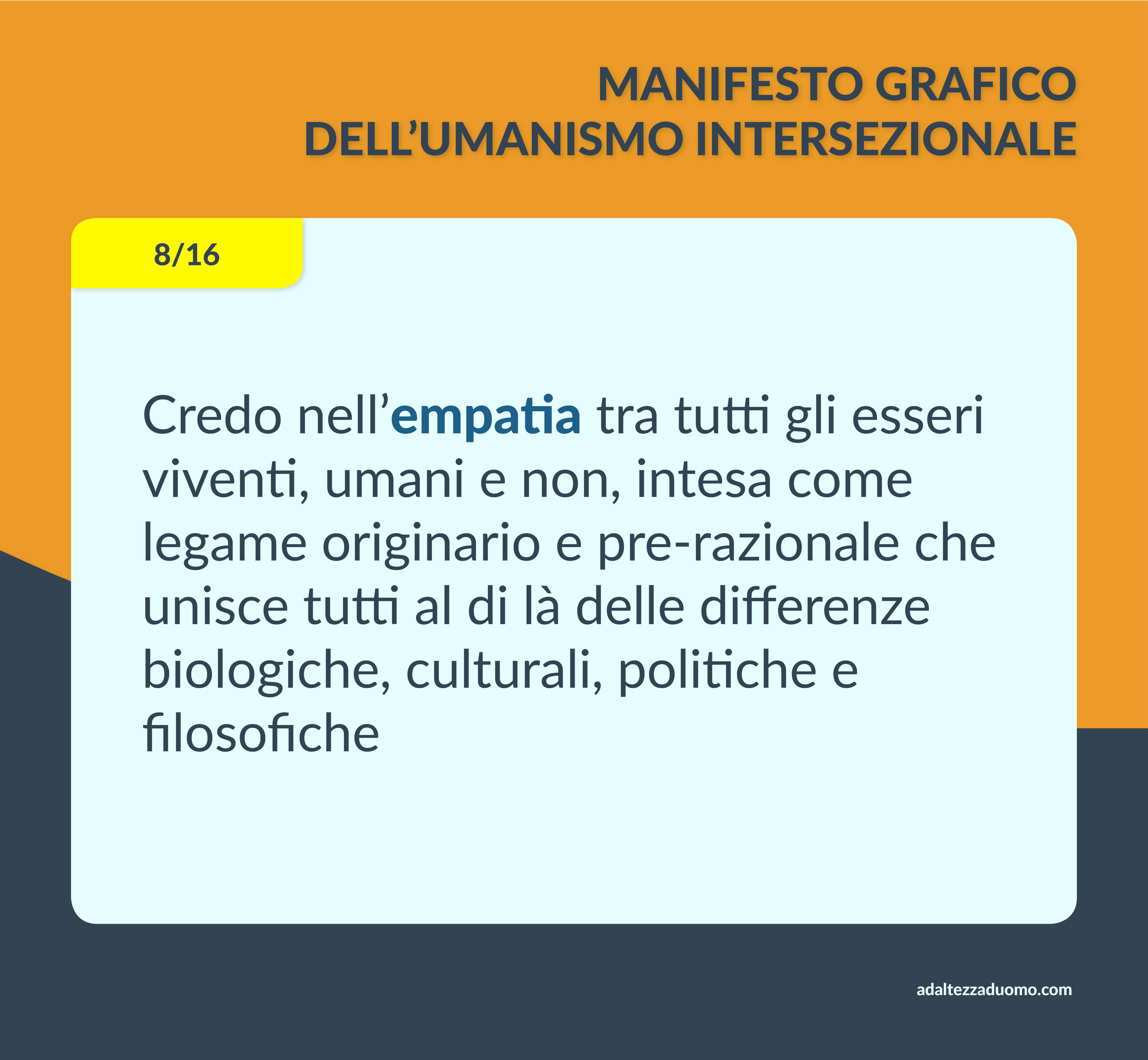 Questo è il Manifesto Grafico dell’Umanismo Intersezionale. Ne riassume in grafica i valori morali e le lotte politiche. Ognuno può sottoscriverlo o condividerlo secondo coscienza, senza bisogno di intermediari o cerimonie di alcun tipo.